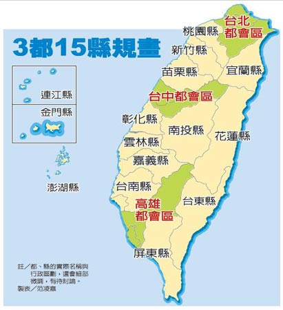 據(jù)稱,“三都十五縣”的三都是:臺(tái)北都會(huì)區(qū)(臺(tái)北市、縣、基隆市,民國(guó)一○三年合并)、臺(tái)中都會(huì)區(qū)(臺(tái)中市、縣,九十九年合并)、高雄都會(huì)區(qū)(高雄市、縣,南部縣市長(zhǎng)爭(zhēng)取一百年合并)。十五縣是:桃園、新竹(新竹市、縣)、苗栗、彰化、南投、云林、嘉義(嘉義市、縣)、臺(tái)南(臺(tái)南市、縣)、屏東、宜蘭、花蓮、臺(tái)東、澎湖、金門、連江。