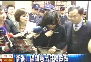 上午9點15分,在律師林達杰的陪同下,陳鎮(zhèn)慧一身黑衣、戴著大墨鏡走進法院,不知是太緊張還是大墨鏡影響,陳鎮(zhèn)慧差點跌了一跤。根據(jù)觀察,陳鎮(zhèn)慧在要進入第七法庭前,身體微微瑟縮,律師拍拍她肩膀安撫她,才終于踏進法庭。