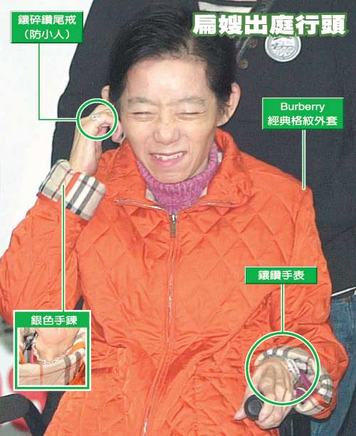 吳淑珍出庭現(xiàn)身,一件亮橘色的外套,讓她看起來氣色很好。這件鋪棉外套是吳淑珍最愛的英國名牌Burberry熱賣款,一件要價25000元;另外,雖然沒有滿身珠光寶氣,但看她揮手致意,右手小指戴了1克拉鉆石,這只防小人的尾戒也要大約60萬。