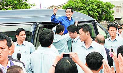 中新網(wǎng)3月23日電 據(jù)臺(tái)灣《蘋(píng)果日?qǐng)?bào)》報(bào)道,馬英九22日下午前往嘉義視察途中,座車(chē)左后輪突然爆胎,緊跟在后方的廂型車(chē)緊急煞車(chē)與座車(chē)輕微追撞,由于事發(fā)突然,隨行安全人員嚇了一跳,馬英九了解狀況后,立即換車(chē)?yán)^續(xù)行程。馬英九安全未受影響,事后也表示自己“處變不驚”。