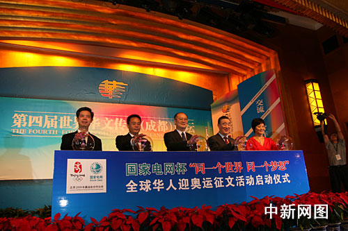 北京2008年奧運(yùn)會離我們越來越近了。為了表達(dá)全球華人對北京2008年奧運(yùn)會的期盼和祝福,聚僑心、傳華聲,國家電網(wǎng)公司和中國新聞社將共同主辦國家電網(wǎng)杯"同一個世界同一個夢想"全球華人迎奧運(yùn)征文活動。借此機(jī)會,我們舉行征文活動啟動儀式。