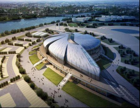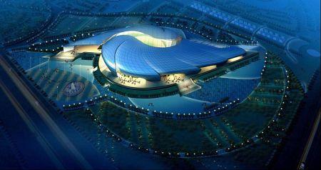 南沙體育館是亞運會武術比賽場館,因此在設計上場館也體現(xiàn)了中國武術的意境。南沙體育館的外殼分九個曲面單元,單元間片片層疊,并分為南北兩組以比賽大廳圓心為中心呈螺旋放射狀展開。這種富有動感的設計隱喻了中國武術的最高境界——“陰陽俱合,天人合一”。同時結合廣東海洋文化的特征,借鑒了富有肌理變化的“海螺”外殼作為造型設計的意向。南沙體育館主體鋼結構部分采用了雙層環(huán)形張弦穹頂結構,主跨度達到了98米。