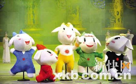 ——廣州亞運(yùn)的吉祥物取名樂羊羊,一套5種,為歷屆亞運(yùn)會(huì)中數(shù)量最多的吉祥物。形象是運(yùn)動(dòng)時(shí)尚的五只羊,分別取名“阿祥”、“阿和”、“阿如”、“阿意”、“樂羊羊”,組成“祥和如意樂洋洋”,表達(dá)了廣州亞運(yùn)會(huì)將給亞洲人民帶來(lái)“吉祥、和諧、幸福、圓滿和快樂”的美好祝愿,也同時(shí)傳達(dá)了本屆運(yùn)動(dòng)會(huì)“和諧、激情”的理念。