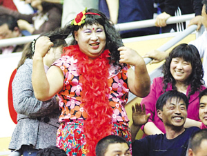 昨天的南京奧體看臺(tái)上,還來(lái)了一位貌似乳神的人,這究竟是什么回事呢?昨天比賽還沒(méi)開(kāi)始,奧體中心體育場(chǎng)的50區(qū)看臺(tái)就熱鬧無(wú)比。很多球迷紛紛圍到一名打扮性感的人邊上,爭(zhēng)相與“她”合影。而本報(bào)記者也從內(nèi)場(chǎng)走到看臺(tái)附近一探究竟。原來(lái),這是一位老舜天球迷,聞之巴拉圭正版乳神因故未能前來(lái)南京,為了彌補(bǔ)大家的遺憾,也是順便活躍一下現(xiàn)場(chǎng)氣氛,照著巴拉圭乳神里克爾梅的外形好好地裝扮了一下自己。由于這位男球迷是反串表演,所以他還特意用材料加以修飾,讓自己胸部的豐滿程度更加接近于乳神。于是,他便成為了昨天現(xiàn)場(chǎng)最為“耀眼”的明星,受歡迎程度甚至超過(guò)了巴拉圭球星圣克魯斯。除了這位比較搞怪的球迷,昨天來(lái)自全國(guó)各地的著名球迷也聚集奧體中心,“羅西”、“胖哥”等等耳熟能詳?shù)拿譃槟暇⿰W體中心的這場(chǎng)中巴之戰(zhàn)增色不少。