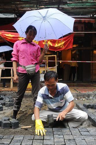 來自廣西的黃秀樹(左)為正在鋪路的丈夫廖孫國一邊撐傘一邊遞磚