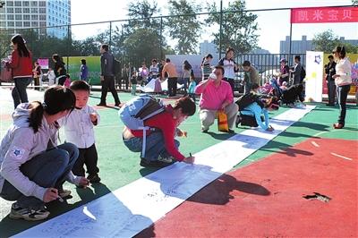 昨天上午9點(diǎn),建外SOHO文化體育廣場(chǎng)迎來(lái)首屆寶寶亞運(yùn)會(huì)。百余名寶寶在家長(zhǎng)的引導(dǎo)下,在象征著亞運(yùn)會(huì)開幕時(shí)間的11.12米長(zhǎng)的橫幅上,親手寫下自己的名字和祝福;顒(dòng)現(xiàn)場(chǎng),寶寶們?cè)诟改傅呐惆橄卤M享運(yùn)動(dòng)的樂趣。據(jù)了解,此次活動(dòng)是由朝陽(yáng)區(qū)建外社區(qū)及中國(guó)婦女兒童喜愛品牌辦公室聯(lián)合主辦,橫幅將于近日寄往亞運(yùn)組委會(huì)。