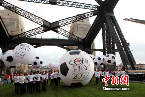 為表達(dá)悉尼對(duì)澳大利亞申辦2022年FIFA世界杯的支持,一個(gè)印著“Come Play”字樣,高達(dá)四米的巨型足球沿著澳洲標(biāo)志悉尼大橋的中心滾動(dòng),帶動(dòng)起“來踢球”的熱忱與激情。