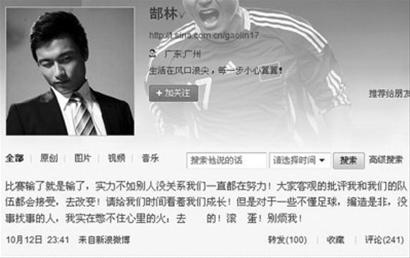國足12日輸球后,郜林發(fā)布的微博截屏。