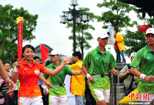 22日的亞運(yùn)火炬?zhèn)鬟f讓現(xiàn)代文明和古代文化在這里激情交匯。上午9時(shí),火炬?zhèn)鬟f點(diǎn)火儀式在明代閩贛交通要沖廣濟(jì)門城樓前舉行,在具有濃郁潮州特色的潮州醒獅表演后,第一棒火炬手張宛瓊從潮州市委書記駱文智手中接過火炬。