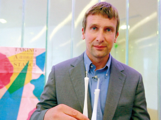 11月14日晚,廣州新電視塔頂層,在這個(gè)尚未開(kāi)放的區(qū)域,這座“小蠻腰”的設(shè)計(jì)師馬克(MARK HEMEL,見(jiàn)上圖)接受了羊城晚報(bào)記者專(zhuān)訪。馬克的記憶,還停留在亞運(yùn)開(kāi)幕式那晚電視塔璀璨奪目的那刻,他既驚嘆又感慨,連連稱(chēng):“‘女兒’終于出閣了!”
