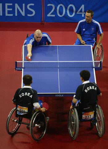 乒乓球殘疾人比賽在比賽的類型上有站立和輪椅兩大種類;在比賽的形式上有單打和雙打;在比賽的項(xiàng)目上有團(tuán)體和單項(xiàng)。