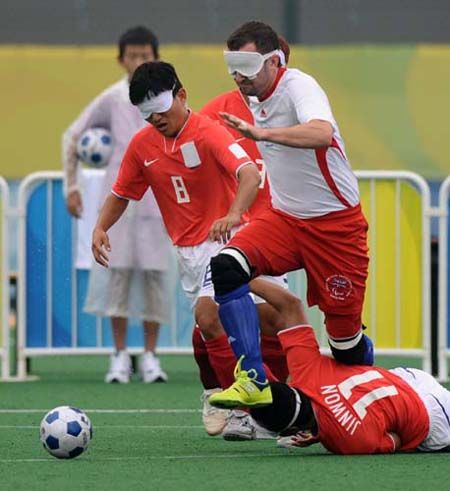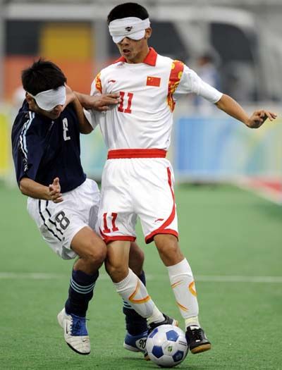 五人制(盲人)足球比賽是以攻破對方球門得分為目的而進(jìn)行的同場攻守對抗項目。每隊由5名場上隊員和5名替補隊員組成,其中包括守門員和替補守門員各1名。除守門員外,其他隊員都為盲人。只有守門員可以在規(guī)定的區(qū)域內(nèi)用手觸球。比賽中,進(jìn)攻方目標(biāo)是把球踢進(jìn)對方球門得分,而防守方則是盡力阻止對方得分。
