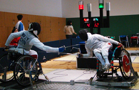 輪椅擊劍運(yùn)動(dòng)是根據(jù)下肢殘疾運(yùn)動(dòng)員(包括截肢, 脊髓灰質(zhì)炎, 腦癱和截癱)的特點(diǎn)而專(zhuān)門(mén)設(shè)計(jì)的一項(xiàng)運(yùn)動(dòng)。對(duì)于觀眾來(lái)說(shuō),輪椅擊劍運(yùn)動(dòng)最讓他們感到與眾不同的,就是比賽雙方運(yùn)動(dòng)員的輪椅都固定在可調(diào)節(jié)軌道的框架上進(jìn)行比賽。然而,盡管坐在這樣的輪椅上,運(yùn)動(dòng)員只能自由移動(dòng)他們身體的上半部分,但他們出劍的速度并不比健全運(yùn)動(dòng)員慢,甚至要更快。