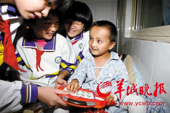 6歲的小華琛坐在兒童醫(yī)院的病床上,雙腳打著石膏———這是他第三次打石膏做矯正。他從小失去父母,又患有先天性馬蹄內(nèi)翻足,性格內(nèi)向。不過(guò),來(lái)廣州近一個(gè)月的日子,他不斷被熱心人改變著。1日,廣州市第13中學(xué)8名學(xué)生代表也來(lái)到兒童醫(yī)院探望小華。ㄒ(jiàn)右圖)。