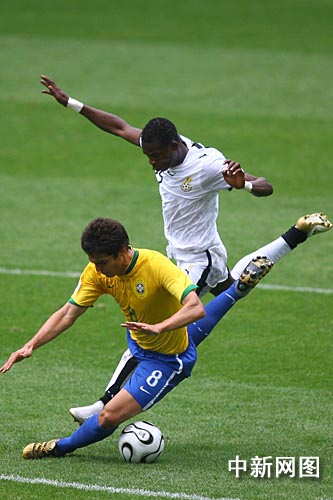 比賽開始后巴西隊并沒有急于大舉壓上進(jìn)攻,第14分鐘加納獲得任意球機(jī)會,阿多的頭球被塞薩爾神勇?lián)涑,力保巴西城門不失。第16分鐘巴西獲得角球,卡卡前點擺渡,效力俄羅斯莫斯科中央陸軍的前鋒瓦格納墊射破門,幫助巴西1-0領(lǐng)先。隨后比賽雙方互有攻守,但都沒有進(jìn)球,上半場比賽結(jié)束,巴西1-0領(lǐng)先加納。