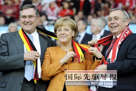 國(guó)際先驅(qū)導(dǎo)報(bào)記者焦宇發(fā)自北京 本屆歐洲杯,每逢德國(guó)隊(duì)攻破對(duì)方球門(mén)時(shí),人們經(jīng)常會(huì)通過(guò)電視鏡頭看到一位“老媽級(jí)”女球迷在看臺(tái)貴賓席上揮舞拳頭,高興得像小孩一樣蹦蹦跳跳。沒(méi)錯(cuò),這就是被德國(guó)媒體戲稱(chēng)為德國(guó)隊(duì)場(chǎng)上“第12人”的德國(guó)總理安格拉•默克爾。