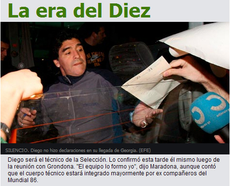 《奧萊報》以“10號的時代”為標題,第一時間發(fā)表了這條消息。阿根廷時間10月28日下午,馬拉多納在和格隆多納面談后確定了自己將成為新的國家隊主教練。他說:“我將自己組建球隊!蓖瑫r他還表示,教練組將以他86年世界杯奪冠時的球隊成員為主,甚至當時的冠軍主帥比拉爾多也有可能再度出山,輔佐愛徒。