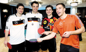 拿著乒乓球拍的波多爾斯基(右一)表情搞怪,波爾(右二)在一眾高人面前顯得有點矮小。