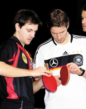 波爾是德國乒乓球的標志性人物,而在德國最為普及的足球運動里,也有不少國腳喜歡打乒乓球。北京時間昨天凌晨,德國國家隊在柏林奧林匹克球場進行訓練,在新聞發(fā)布會開始前,為廣大中國球迷熟悉的乒乓球選手波爾看望了國家隊的隊員,他同韋斯特曼和弗雷德里希切磋了乒乓球技,跟波多爾斯基等球員一起合影。另外,《越獄》德語版主題曲的演唱者、著名歌手阿德爾也來到國家隊,他和波爾一起同國腳們合影留念。
