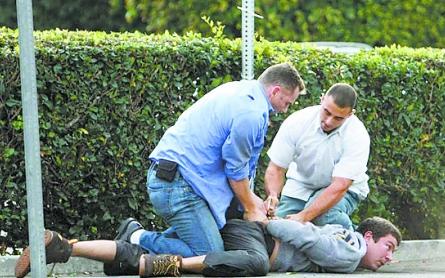 記者顯然不是保鏢的對手,貝克漢姆的兩名保鏢都曾經(jīng)是海軍陸戰(zhàn)隊隊員。他們很快就將記者制服,并專業(yè)地將記者雙手用手銬拷起來壓在地上。直到警察趕到,記者仍然被反拷在地上。記者的相機被一名保鏢直接扔到了垃圾桶內(nèi)。警察趕到后,叫來了救護(hù)車,不過當(dāng)事的3人都拒絕接受治療。隨后3人被帶到警察局,不過貝克漢姆已經(jīng)通知律師處理此事! 我們已經(jīng)將事情寫了報告,目前還沒有人遭扣留或起訴。如果需要,我們會繼續(xù)調(diào)查”,比佛歷山警察局發(fā)言人表示。據(jù)悉,記者在當(dāng)時拍攝的畫面已經(jīng)交給警方。