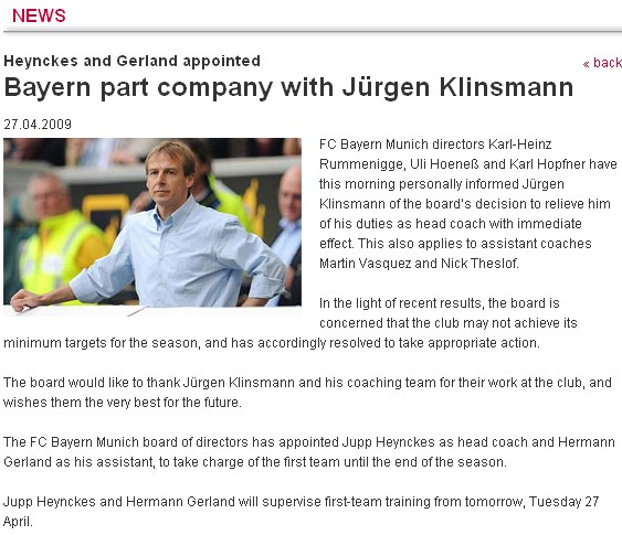 拜仁慕尼黑隊的聲明說,拜仁的主管魯梅尼格等高管27日一早已經(jīng)通知了克林斯曼,俱樂部管理層已經(jīng)決定將其解職,該解職令即刻生效。同時被解雇的,還有克林斯曼的助理教練巴斯克斯(Martin Vasquez )以及特斯洛夫(Nick Theslof)。