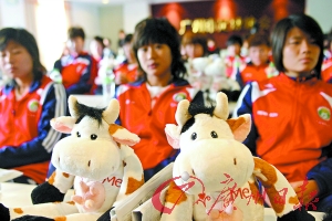 昨天是圣誕節(jié),正在廣州集訓的中國女足首次亮相越秀山體育場。在參加由四國女足邀請賽冠名贊助商南方人才市場主辦的新聞發(fā)布會時,球員們收獲了一份意外的“圣誕禮物”:身上印有“kiss me (親我)”英文字樣的奶牛公仔。贊助商這一別出心裁的禮物,讓包括韓端、畢妍在內(nèi)的女足姑娘們個個愛不釋手。