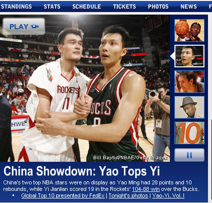 賽后,姚明和易建聯(lián)擊掌致意,這場中國德比也以中國球員的出色表現(xiàn)而收場。而在比賽結束不久,NBA官方英文主網(wǎng)站在第一時間將易建聯(lián)的頭像放在顯要的位置,并介紹了這場中國球員之間的“攤牌”。
