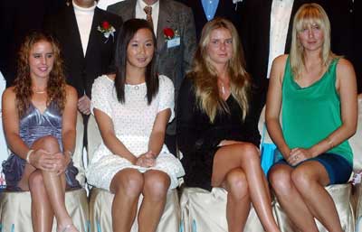 香港網球精英賽昨天在維多利亞公園中央場拉開戰(zhàn)幕。在前晚的賽前酒會上,彭帥和莎拉波娃等人坐到了一起,爭奇斗艷。(左起:彭帥、漢圖楚娃、莎娃)