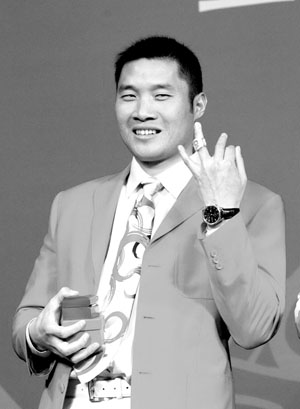 在昨天的頒獎儀式上,孟關(guān)良展示自己獲得的金指環(huán)
