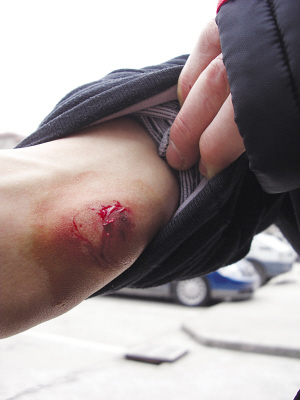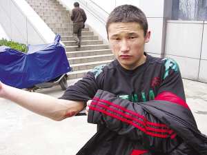 賽后,記者找到了被咬的甘肅選手葉爾蘭別克·卡泰,在隊(duì)友的陪伴下,他正在隊(duì)醫(yī)處給傷口上藥。記者現(xiàn)場(chǎng)可以看到,杯口大的傷口上兩排牙印十分明顯,雖然已經(jīng)經(jīng)過(guò)隊(duì)醫(yī)的處理,但是傷口還在往外滲血。一旁陪伴他的隊(duì)友心痛地說(shuō):“咬得也太狠了吧,以前我們從來(lái)沒(méi)遇到過(guò)這種事情,太惡劣了!”葉爾蘭別克·卡泰告訴記者,當(dāng)時(shí)被咬了以后自己疼得立刻泄了氣,比賽也沒(méi)辦法繼續(xù)下去,反而被對(duì)手扳倒取勝,自己心里“實(shí)在咽不下這口氣”。但是考慮到下午還有比賽,加上結(jié)果已經(jīng)無(wú)法改變,他也只好接受這個(gè)事實(shí)。