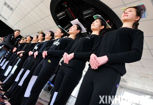 3月25日,頒獎(jiǎng)禮儀志愿者在接受站姿培訓(xùn)。
