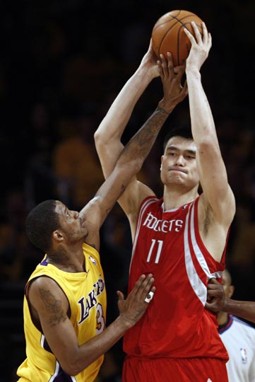 中新網(wǎng)5月5日電 北京時間今日,休斯敦火箭和洛杉磯湖人的西部半決賽第一場比賽在湖人主場打響。在付出了巴蒂爾血濺賽場和姚明膝蓋受傷的代價后,火箭在客場以弱勝強,以100-92拿下湖人,打出了一場蕩氣回腸的比賽。姚明砍下28分10籃板2蓋帽,阿泰21分7助攻,小布19分,巴蒂爾6分,斯科拉10分?票瓤诚32分,加索爾14分。