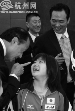 本報(bào)訊 因?yàn)槎萝嚕s到杭州天馬大酒店時(shí)晚點(diǎn)了,“小愛等了你一刻鐘”,福原愛的教練鄭慧萍透露:小愛隨日本隊(duì)下樓赴歡迎晚宴去了,“別急,我來安排”。
