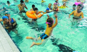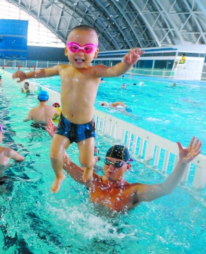 伸伸腿,彎彎腰,一番準(zhǔn)備后,小劉暢迫不及待地跑到泳池邊,父親劉先生抱起兒子,撲通一聲丟下水,接著又一把撈了起來。記者嚇了一跳,耳邊卻傳來小家伙“咯咯”的笑聲。“我給他試試水,適應(yīng)一下。”劉先生解釋,劉暢不怕水,對(duì)水有一種天生的親切感,這種夸張的“試水”方式,不會(huì)嚇到他,反而讓他感覺很“爽”。