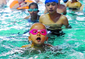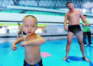接下來(lái),小家伙就要表演20米蛙泳了!把,向前躍——”劉先生的口令剛喊出口,小劉暢胖嘟嘟的小腿一蹬地,已經(jīng)撲通一聲跳進(jìn)水池。很快,他的身體就浮出了水面,滿不在乎地向前游去,可愛(ài)的模樣立刻引來(lái)一陣掌聲。