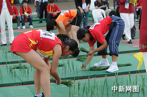 “剛開始感覺(插秧)很有趣,不過練起來可就沒那么輕松了。”這是林貴婷談到比賽時(shí)印象最深的一點(diǎn)。記者在現(xiàn)場看到,比賽在60米長的直跑道上進(jìn)行,選手需先挑起籮筐,單手依次拾起20米處扎成捆的的塑料秧苗,然后在一塊鉆有300個(gè)小孔的綠色木板上進(jìn)行比賽。