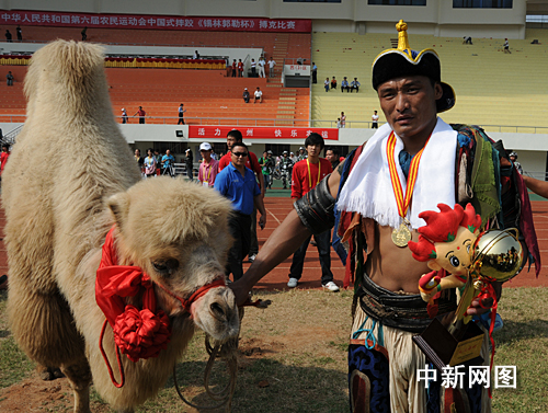 圖為身著傳統(tǒng)摔跤服裝的內(nèi)蒙古選手巴雅爾巴特爾牽著獎(jiǎng)品白駱駝走出賽場(chǎng)。