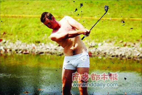 在上周的CA錦標賽中,斯滕森為了救出在泥潭里的球,不惜脫掉衣服鞋襪,只穿了一條白色內褲去救球。有人因此嘲笑斯滕森就像CK內褲模特,不過斯滕森并不在意。本周二,泰格·伍茲在和斯滕森一起參加特維斯特克杯的時候,饒有興致地向斯滕森贈送了兩條相同款式的白色黑邊內褲。伍茲還在內褲上親筆簽下了自己的名字,斯滕森很高興地接受了這兩條絕無僅有的內褲。