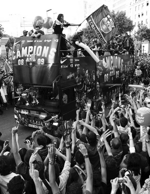 許多球迷也身穿巴薩隊(duì)服,揮舞巴薩隊(duì)旗,不斷高呼“巴薩!巴薩!”“冠軍!冠軍!”整個(gè)巴塞羅那沉浸在狂喜之中。
