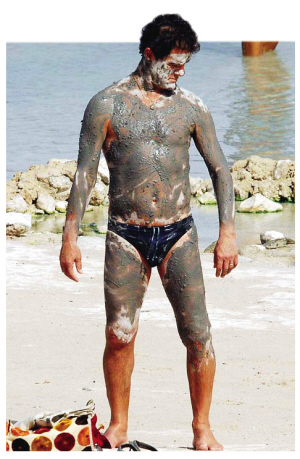 意大利南部小城大多有水溫從32到37攝氏度不等的溫泉,這些景點(diǎn)專(zhuān)門(mén)提供一些泥浴治療服務(wù)。來(lái)這里享受休閑的卡佩羅及其妻子就這樣一不小心落入了記者的鏡頭。與比賽場(chǎng)邊的威嚴(yán)姿態(tài)大相徑庭,鏡頭前只穿了一條黑色泳褲的卡佩羅從頭到腳、甚至包括臉部都涂滿(mǎn)了深灰色的泥漿,要不是那一頭標(biāo)志性的卷發(fā),意大利人的身份還真有些難以“識(shí)別”。身邊的勞拉更將泥漿涂抹得辨別不出了比基尼的花色。低頭看看自己身上的“作品”還算令人滿(mǎn)意,63歲的卡佩羅于是走到勞拉身邊,和自己的老婆開(kāi)起了玩笑。