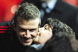 大衛(wèi)·貝克漢姆終于返回他魂?duì)繅艨M的曼徹斯特,盡管正式重返老特拉福德要等到周三,然而,在曼徹斯特機(jī)場,小貝已經(jīng)享受了久違的曼聯(lián)球迷狂熱支持。時(shí)隔7年,“貝克漢姆狂熱”在曼徹斯特絲毫沒有消減,小貝在防暴警察的護(hù)送下,耐心地為球迷簽名、合影,歷盡艱辛才得以登上米蘭大巴離開。一位瘋狂的大媽甚至摟住小貝狂吻(如圖),堪稱小貝的超級(jí)粉絲。