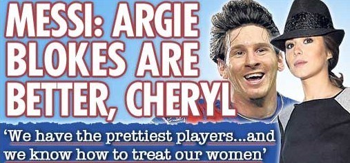 謝麗爾被認(rèn)為是英國最漂亮性感的女人,而丈夫阿什利-科爾卻因?yàn)榛橥狻巴党浴惫钾?fù)了她。對此梅西坦言:“也許謝麗爾現(xiàn)在有點(diǎn)恨英格蘭球員。如果她愿意在世界杯上尋求另一支球隊(duì)去支持,那么非阿根廷莫屬。我們能踢出世界上最漂亮的足球,我們有世界上最英俊的球員,而且阿根廷的男人知道善待他們的女人!
