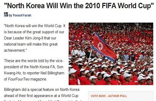 在此前的熱身賽中球隊(duì)2-2戰(zhàn)平前歐洲冠軍希臘,這場(chǎng)平局極大刺激了朝鮮人的信心。在談到為何認(rèn)為球隊(duì)能夠奪冠時(shí),孫光浩態(tài)度十分堅(jiān)定:“本屆世界杯朝鮮將會(huì)奪冠,因?yàn)槲覀冇杏H愛(ài)的領(lǐng)袖金正日的巨大支持。這將會(huì)帶領(lǐng)我們達(dá)到最后的目標(biāo)!”