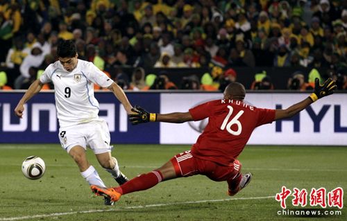 雙方易地再戰(zhàn),第59分鐘南非隊門前再出險情,蘇亞雷斯晃開莫科納下底傳中,卡瓦尼捅射偏出,頗具威脅。第52分鐘,蘇亞雷斯帶球突入禁區(qū)被南非球員拉倒,不過主裁判并沒有任何表示。東道主逃過一劫。2分鐘后,烏拉圭再獲任意球機會,盧加諾在無人防守的情況下頭球攻門頂偏。