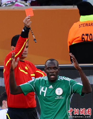開場(chǎng)后雙方都比較謹(jǐn)慎,比賽略顯沉悶。上半時(shí)進(jìn)行到第16分鐘尼日利亞率先打破僵局,希臘后衛(wèi)帕帕斯塔多普洛斯拉倒尼日利亞奧代姆溫吉,裁判判罰任意球并掏出黃牌。尼日利亞12號(hào)前鋒烏切任意球直接射門破門,這也是本屆世界杯賽場(chǎng)上第一個(gè)任意球直接破門。