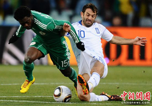 中新網(wǎng)6月17日電 北京時(shí)間今晚22時(shí),南非世界杯B組第二輪比賽打響,由歐洲勁旅希臘在布隆方丹的自由洲球場(chǎng)迎戰(zhàn)非洲雄鷹尼日利亞。上班時(shí)尼日利亞任意球率先破門,但此后被紅牌罰下一人,希臘隊(duì)隨即抓住機(jī)會(huì),在上下半場(chǎng)各入一球,以2-1逆轉(zhuǎn)擊敗尼日利亞隊(duì)。
