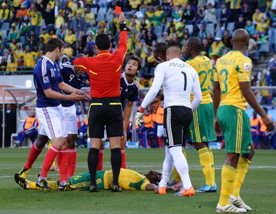 也許失球只是法國隊噩夢的開始,比賽進(jìn)行到第25分鐘,法國隊攻入南非隊禁區(qū),中場球員、有著“齊達(dá)內(nèi)接班人”之稱的古爾庫夫在爭頂頭球時肘部擊中了對手,南非隊隊員就勢倒地不起做昏厥狀。主裁判果斷出示紅牌,將古爾庫夫罰下。