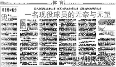 今年9月2日進行的中甲聯(lián)賽中,四川隊坐鎮(zhèn)主場四川大學(xué)體育場對陣青島海利豐,客場作戰(zhàn)的海利豐3球領(lǐng)先,但該隊隊員卻在最后時刻連續(xù)三次吊射本方球門,不得不讓人懷疑有人在操控比賽。中青報這篇《一名現(xiàn)役球員的無奈與無望》的報道就從這場比賽切入正題,報道中稱,一名不愿意透露姓名的川足隊員說,“我也想盡早知道這場球的調(diào)查結(jié)果,我不是希望青島被罰降級或四川留在中甲,我是真想知道能不能從這場比賽中找到假球的證據(jù)!