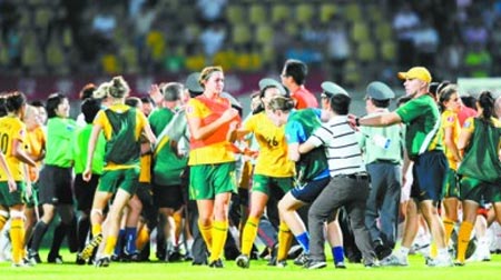8月3日晚,中國(guó)青年女足在武漢2∶1險(xiǎn)勝澳大利亞隊(duì),亞青賽兩連勝提前小組出線,但在比賽結(jié)束后,雙方發(fā)生沖突,一名澳大利亞球員將中國(guó)球員張?jiān)酱虻,雙方替補(bǔ)球員和教練見(jiàn)狀全部沖到場(chǎng)內(nèi),一片混亂之后,經(jīng)過(guò)亞足聯(lián)官員的親自協(xié)調(diào),事件才平息。據(jù)了解,澳球員之所以“發(fā)飆”,是覺(jué)得輸?shù)煤堋案C囊”,覺(jué)得“中國(guó)隊(duì)做了裁判工作”。路透社的報(bào)道說(shuō)“這起事件無(wú)疑對(duì)中國(guó)足球的聲譽(yù)又是一次打擊。 ”但事實(shí)上,算上上周日中超聯(lián)賽重慶隊(duì)主教練阿里·哈恩的“瘋狂咆哮”,連續(xù)兩次都是外國(guó)教練和外國(guó)球員在中國(guó)綠茵撒野,這里必須要問(wèn)一句:憑什么?