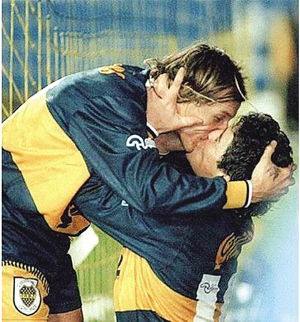 阿根廷人的豪放這一刻展現(xiàn)得淋漓盡致,主角是球王和風(fēng)之子。當(dāng)時(shí)風(fēng)之子接到球王的妙傳破門得分,兩個(gè)人當(dāng)場(chǎng)不顧全場(chǎng)所有觀眾和其他的隊(duì)友激吻在一起,長(zhǎng)達(dá)6分鐘,而且還是“舌吻”!當(dāng)時(shí)引起了全世界的轟動(dòng)!好戲還在后頭:卡尼吉亞的老婆說(shuō):“馬拉多納是同性戀,他喜歡親吻卡尼吉亞的嘴唇。”當(dāng)然老馬很生氣,但是他表示:“看在卡尼吉亞的份上就不追究了!”